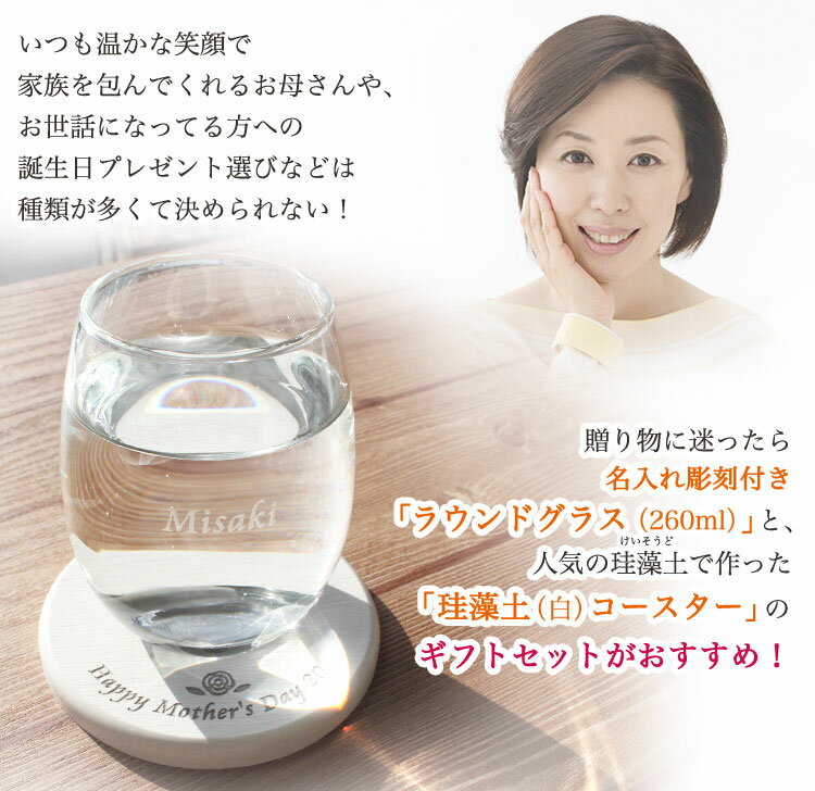 名前 入り ラウンドグラス(260ml)&珪藻土(白)コースターセット/ラウンドグラスにお名前が入れられます/コースターへのデザインは誕生日や還暦など数種類ご用意!/コースターは白/珪藻土なので水を吸い取ります/母の日や父の日デザインあり!