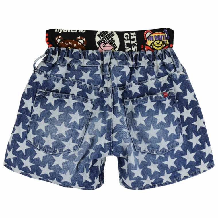 色展開によってスターの大きさが変わるデニムショートパンツ。