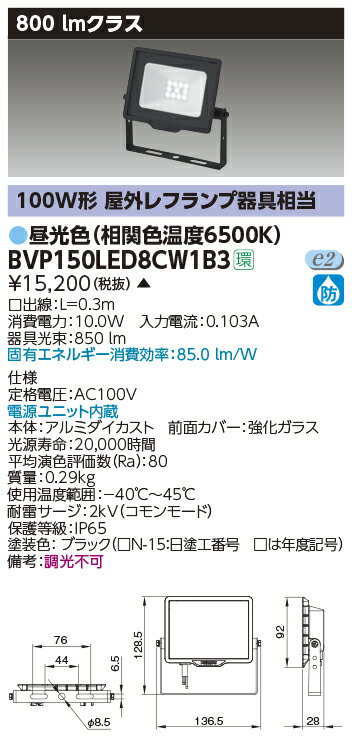 メーカー:TOSHIBA/東芝ライテック LEDフラッドライト フィリップスブランド 800lmクラス 100W形 屋外レフランプ器具相当 屋外用 配光角:110° 昼光色(相関色温度6500K) 口出線:L=0.3m 消費電力:10W 器具光束:850lm 定格電圧:AC100V 電源ユニット内蔵 本体:アルミダイカスト 前面カバー:強化ガラス 光源寿命:20,000時間 平均演色評価数:Ra80 質量:0.29kg 使用温度範囲:-40℃〜45℃ 耐雷サージ:2kV(コモンモード) 保護等級:IP65 塗装色:ブラック 調光不可 ≪オプションパーツ≫(別売り) フランジ:CF-BVP0F(K) スパイク:CF-BVP0S(K) バイス:CF-BVP0V(K) フランジ・スパイク・バイス用アタッチメント:CF-BVP0AT(K)VS ※オプションとの組み合わせはアタッチメントが必要です。