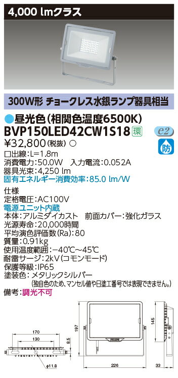 カテゴリ:照明器具 施設照明 屋外用照明器具 投光器 メーカー:東芝 型番:BVP150LED42CW1S18