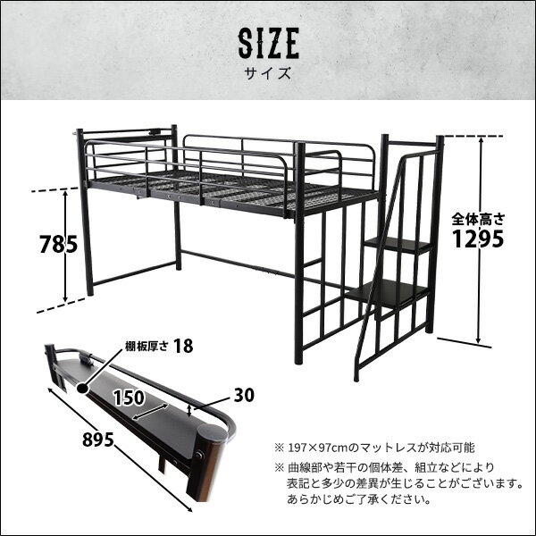 [8月25日はポイント5倍] ロフトベッド 階段付き 【送料無料】 おしゃれ アイアンフレーム ハイタイプ シングルベッド 高さ調節 一人暮らし 宮棚付き 宮付き コンセント付き メッシュ 頑丈 ハンガー付き ベッド下 スペース ミドル