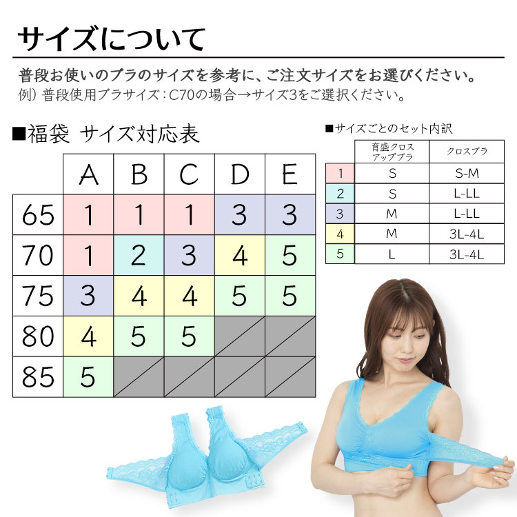 育盛ブラ3点セット福袋 セット内容 育盛クロスアップブラ 2枚(ブラック1枚+色おまかせ1枚)&クロスブラ24 1枚(色おまかせ) サイズ サイズ1サイズ2サイズ3サイズ4サイズ5 注意事項 ・本品は医療用ではございません。