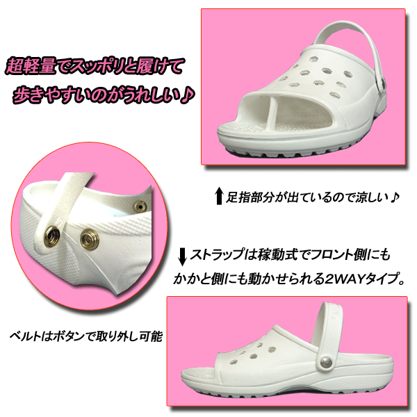 ●カラー/ホワイト・グリーン ●素材/甲材・中敷・底材:EVA(エバロン) ●ワイズ/4E相当 ●ヒール高/約2.5cm ●重量/片足約100g(Mサイズ) ●カラー/ホワイト ●サイズ/ (S)22.0〜22.5cm (M)23.0〜23.5cm (L)24.0〜24.5cm ■フィッティング こちらのサンダルは履き口、長さとも大きめです 注意 画面上と実物では多少色具合が異なって見える場合もございます。